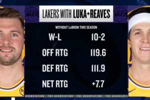 本賽季詹姆斯缺席而東契奇、里夫斯出戰(zhàn)時,湖人10勝2負