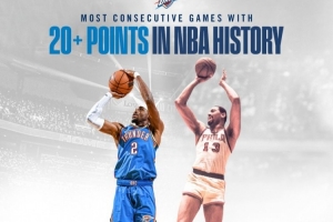這樣,亞歷山大連續(xù)127場至少20分,正式超越1961-63賽季的張伯倫(126場),登頂NBA歷史第一。