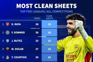 數(shù)據(jù)統(tǒng)計(jì)顯示,本賽季歐洲五大聯(lián)賽門將中,拉亞各項(xiàng)賽事出戰(zhàn)38場(chǎng)比賽,有19場(chǎng)零封,零封場(chǎng)次最多。