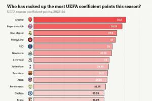 體育資訊03月14日訊 The Athletic統(tǒng)計了歐洲聯(lián)賽俱樂部本賽季目前為止掙得的歐足聯(lián)系數(shù)積分,阿森納以30.5分領(lǐng)跑,拜仁、皇馬、中日德蘭、巴黎位列前五。