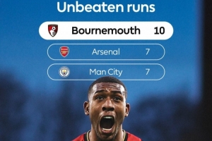 英超官方數(shù)據(jù)統(tǒng)計(jì)顯示,伯恩茅斯的10場(chǎng)不敗是目前英超最長(zhǎng),阿森納和曼城都是7場(chǎng)不敗。