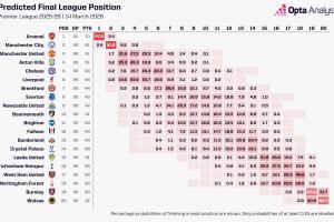 據(jù)OPTA利用超級(jí)計(jì)算機(jī)進(jìn)行的10000次模擬,阿森納奪得英超冠軍的概率為97.6%,曼城奪冠概率為2.4%。