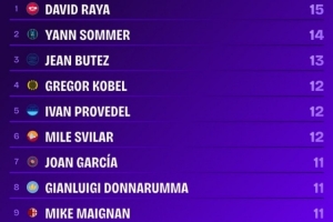 排在他身后的是國(guó)米門(mén)將索默,有14場(chǎng)零封。巴薩門(mén)將霍安·加西亞、曼城門(mén)將多納魯馬、米蘭門(mén)將邁尼昂和皇馬門(mén)將庫(kù)爾圖瓦都是11場(chǎng)零封。