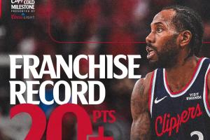 倫納德單賽季連續(xù)45場比賽得分20+,超越鮑勃·麥卡杜(1974-75賽季,連續(xù)44場)獨占快船隊史第一。