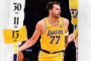 賽后,湖人官方曬出東契奇的數(shù)據(jù)海報,配文寫道:“三雙,外加絕殺!東契奇,今晚屬于你!??”