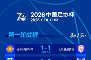 體育資訊3月15日訊 2026年足協(xié)杯第一輪第三個(gè)比賽日結(jié)束,北京通州鵬瑞、寧夏平羅恒利、武漢聯(lián)鎮(zhèn)、聊城傳奇綠業(yè)春、泉州青工走走紡織五支球隊(duì)晉級(jí)。