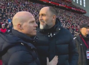 轉播鏡頭顯示,比賽開始前,圖多爾出現(xiàn)在安菲爾德場邊,他走向一個穿著深色外套,雙臂交叉的人面前,拍了拍他的肩膀,打招呼并與他握手——可能認為對方是斯洛特。