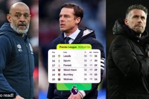 本輪英超在積分榜后6位的球隊(duì)中,有5隊(duì)都拿到1分(狼隊(duì)還未賽),其中利茲聯(lián)0-0戰(zhàn)平水晶宮,諾丁漢森林0-0戰(zhàn)平富勒姆,西漢姆1-1戰(zhàn)平曼城,伯恩利0-0戰(zhàn)平伯恩茅斯。