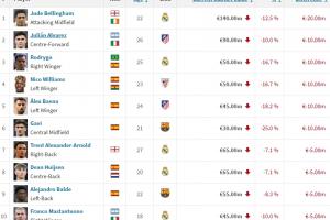 體育資訊03月16日訊 德轉(zhuǎn)今日更新西甲身價(jià),貝林、羅德里戈等多名皇馬球員身價(jià)下跌。