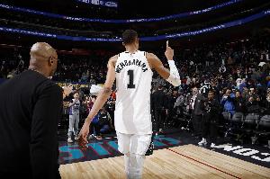 本場比賽文班亞馬開局狀態(tài)一般,失誤偏多,但下半場他狀態(tài)復(fù)蘇,第三節(jié)連續(xù)命中三分,8記三分追平生涯紀錄,最終幫助球隊贏下強敵。